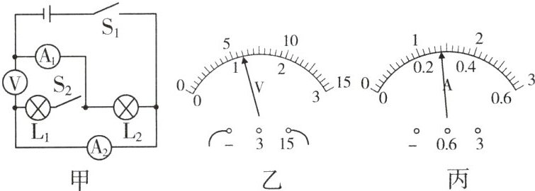 7. (2024·宿州灵璧英才中学质检)如图甲所示,电源电压保持不变,仅闭合开关 $ S_1 $,电压表示数如图乙;闭合 $ S_1 $、$ S_2 $,两电流表的指针均如图丙所示。当 $ S_1 $、$ S_2 $ 都闭合时,通过 $ L_1 $ 的电流为