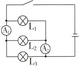 的电流。测得电流表 $ A_1 $ 的示数是 $ 0.5 \, A $,电流表 $ A_2 $ 的示数是 $ 0.3 \, A $,且通过 $ L_2 $ 的电流是 $ L_1 $ 的电流的2倍,则通过 $ L_3 $ 的电流是0.3