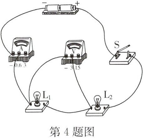 4. 如图所示电路,闭合开关,小灯泡$ L_1、$$L_2 $都发光,两电表都有示数,过一会儿其中一个灯泡突然熄灭,一个电表有示数,另一个电表无示数. 造成此现象的原因可能是(