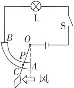 12. 如图所示是亚宁同学设计的一个风力测定仪,O是转动轴,OC是金属杆,下面连接着一块受风板,无风时OC是竖直的,风越强,OC杆偏转的角度越大。AB是一段弧形电阻,P点(动点)是金属杆与弧形电阻相接触的点,电路中接有一个灯泡L,测风力时,闭合开关S,通过分析可知:金属杆OC与弧形电阻AB组合在一起相当于一个