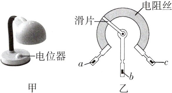8. 如图甲是常用的一种亮度可调的台灯,图乙为其用于调亮度的电位器结构图,a、b、c是它的三个接线柱,a、c分别与弧形电阻丝的两端相连,b与金属滑片相连,转动旋钮,通过改变接入电路中电阻丝的长度来改变台灯亮度,下列分析正确的是(