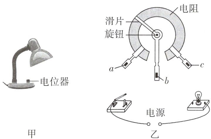 6. (2024·临沂兰山新桥中学月考)如图甲所示是生活中常见的亮度可调的台灯,图乙是台灯的工作电路的示意图,a、b、c为电位器的接线柱.要求:旋钮带动滑片逆时针转动时,灯泡变暗.请完成该电路的连接.