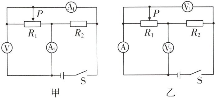 D.在图乙中,电压表$V_1$示数不变,电压表$V_2、$电流表A示数均变大