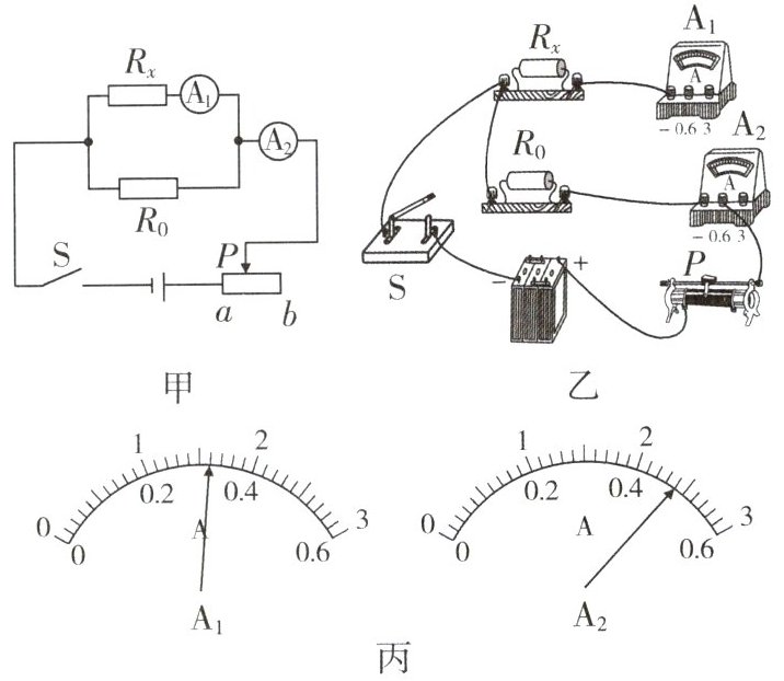 (3)调节滑动变阻器,使两个电流表有恰当的读数,如图丙,电流表 $ A_1 $、$ A_2 $ 的读数分别为 $ I_1 = $______ $ A $,$ I_2 = $______ $ A $.