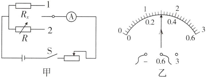 (2)闭合开关 $ S $,将单刀双掷开关拨到 $ 1 $,调节滑动变阻器,使电流表指针指到某一数值,如图乙,电流表读数为