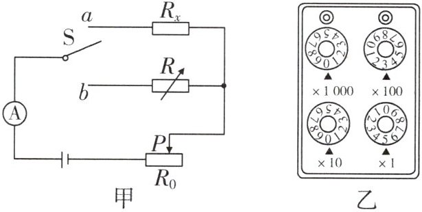 $ \frac{I_2}{I_1}R' $(选填“$ > $”“$ < $”或“$ = $”).(3)图乙所示电阻箱的示数为