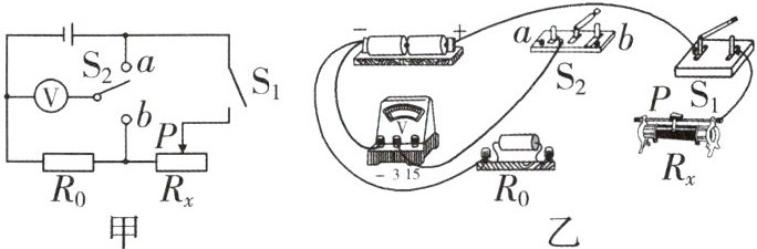 8. 现有下列器材:两节干电池、一个开关 $ S_1 $、一个单刀双掷开关 $ S_2 $、电压表($ 0 \sim 3 V $、$ 0 \sim 15 V $)、阻值为 $ 10 \Omega $ 的定值电阻 $ R_0 $、导线若干. 利用这些器材测量滑动变阻器 $ R_x $ 的最大阻值,实验电路图如图甲所示.