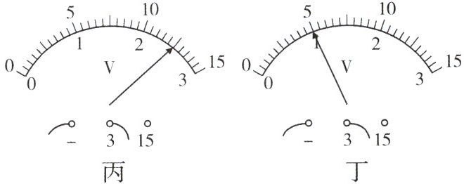 ①移动滑动变阻器的滑片,使其连入电路的阻值最大,闭合开关 $ S_1 $,将开关 $ S_2 $ 拨至 $ a $ 处,记下电压表的示数 $ U_1 = $______ $ V $(如图丙);②将开关 $ S_2 $ 拨至 $ b $ 处,记下电压表的示数 $ U_2 = $______ $ V $(如图丁);③先断开开关 $ S_1 $ 和 $ S_2 $,再撤去______两端的导线,然后整理器材.