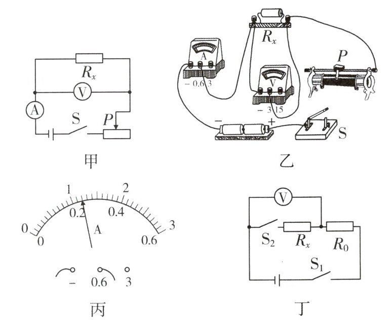 ③闭合开关 $ S $,将滑动变阻器的滑片 $ P $ 移至某一位置后,电压表的示数为 $ 2.4 V $,电流表的示数为 $ I $,如图丙所示,则 $ I = $______ $ A $,待测电阻 $ R_x = $______ $ \Omega $.