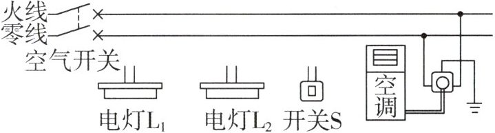 9. 教室中有一台空调和多盏标有“220 V 18 W”的电灯,其中黑板前方的电灯 $L_{1}$ 和 $L_{2}$ 由一个开关 $S$ 单独控制,如图所示. 请用笔画线表示导线,将电灯 $L_{1}$、$L_{2}$ 和开关 $S$ 接入电路中,使两灯都正常发光.