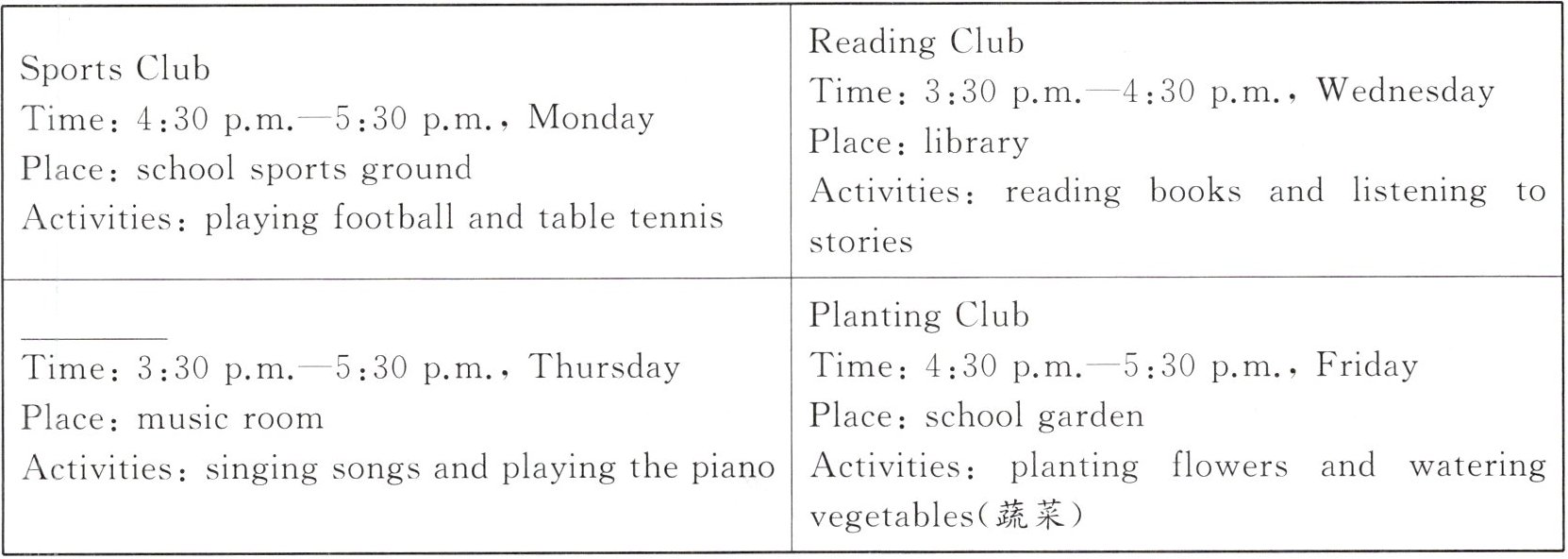 二、[生活体验]课后社团是校园里的“兴趣小天地”,既可以让孩子们拓展兴趣边界,又可以充实他们的课后时光。社团种类丰富,该怎么选择喜欢的社团呢?阅读海报,完成任务。