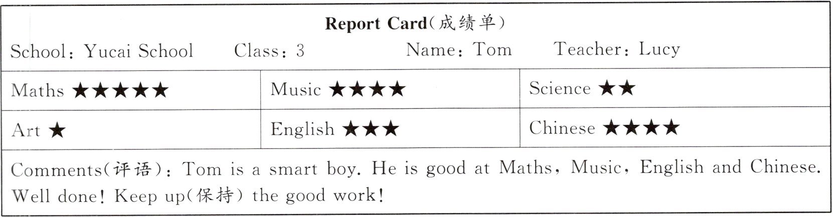 二、[生活体验]成绩单像一面小镜子,既留存着努力收获的分数印记,也藏着老师对进步的期许。新学期,汤姆整理书房时发现了上学期的成绩单,成绩单上记载了哪些信息呢?请你阅读成绩单,判断正(T)误(F)。