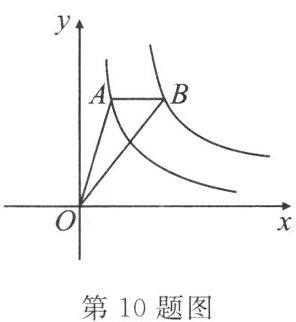 10. (岳阳楼区期中)如图,在平面直角坐标系中,点 $ A $ 是函数 $ y = \frac{1}{x} (x > 0) $ 图象上一点,过点 $ A $ 作 $ x $ 轴的平行线,交函数 $ y = \frac{k}{x} (x > 0) $ 的图象于点 $ B $,连接 $ OA $、$ OB $。若 $ \triangle OAB $ 的面积为 $ \frac{1}{2} $,则 $ k $ 的值为