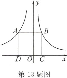 13. 如图,点 $ A $ 在反比例函数 $ y = \frac{k}{x} (k \neq 0) $ 图象的一支上,点 $ B $ 在反比例函数 $ y = -\frac{k}{2x} $ 图象的一支上,点 $ C $,$ D $ 在 $ x $ 轴上,若四边形 $ ABCD $ 是面积为 $ 9 $ 的正方形,则实数 $ k $ 的值为
