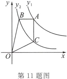 11. (武陵区模拟)如图,点 $ A $ 是反比例函数 $ y_1 = \frac{k}{x} (k \neq 0, x > 0) $ 的图象上的一动点,过点 $ A $ 分别作 $ x $ 轴、$ y $ 轴的平行线,与反比例函数 $ y_2 = \frac{4}{x} (x > 0) $ 的图象交于点 $ B $、点 $ C $,连接 $ OB $,$ OC $。若四边形 $ OBAC $ 的面积为 $ 6 $,则 $ k = $