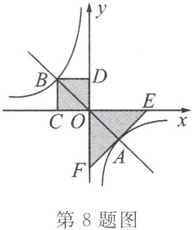 8. (港南区模拟)如图,过点 $ O $ 作直线与双曲线 $ y = \frac{k}{x} (k \neq 0) $ 交于 $ A $,$ B $ 两点,过点 $ B $ 作 $ BC \perp x $ 轴于点 $ C $,作 $ BD \perp y $ 轴于点 $ D $。在 $ x $ 轴、$ y $ 轴上分别取点 $ E $,$ F $,使点 $ A $,$ E $,$ F $ 在同一条直线上,且 $ AE = AF $。设图中矩形 $ ODBC $ 的面积为 $ S_1 $,$ \triangle EOF $ 的面积为 $ S_2 $,则 $ S_1 $,$ S_2 $ 的数量关系是