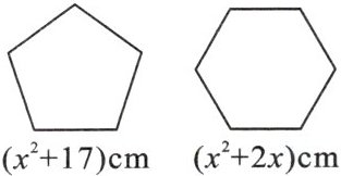 9. 如图,用两段等长的铁丝恰好可以分别围成一个正五边形和一个正六边形,其中正五边形的边长为$(x^2 + 17)$cm,正六边形的边长为$(x^2 + 2x)$cm(其中$x > 0$)。求这两段铁丝的总长。