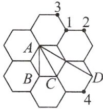 14.(日常学习情境)蜜蜂的巢房是令人惊叹的神奇天然建筑物.如图是蜂巢的部分横剖面,由 7 个相同的正六边形组成,每个正六边形的顶点叫作格点,顶点都在格点上的三角形叫作格点三角形,则当以 $AD$ 为斜边的格点三角形 $ADE$ 与 $\triangle ABC$ 相似时,点 $E$ 的位置可以为(