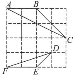 解:△ABC 和△DEF 相似;理由如下:由图形可知 AB=2,根据勾股定理得,$BC=2\sqrt{2}$,$AC=2\sqrt{5}$,$DE=\sqrt{2}$,$DF=\sqrt{10}$,$EF=2$,