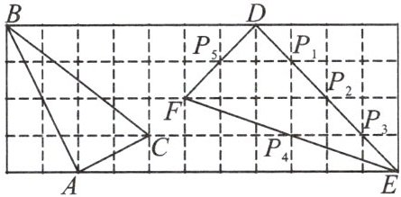 12. 如图,在边长为$1$的小正方形组成的网格中,$\triangle ABC和\triangle DEF$的顶点都在格点上,$P_{1}$、$P_{2}$、$P_{3}$、$P_{4}$、$P_{5}是\triangle DEF边上的5$个格点,请按要求完成下列各题: