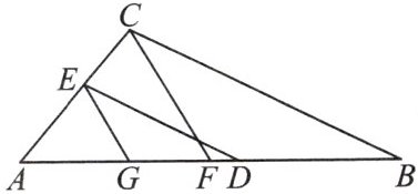 9. 如图所示,在△ABC中,D,E分别是△ABC的边AB,AC上的点,DE//BC,CF、EG分别是△ABC和△ADE的中线,已知AD:DB = 4:3,AB = 18cm,EG = 4cm,则CF的长为