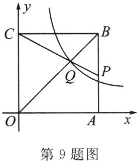 9. (大单元整合) 如图,正方形$OABC的边长为6$,$A$,$C分别位于x$轴,$y$轴上,点$P在AB$上,$CP交OB于点Q$,函数$y= \frac{k}{x}的图象经过点Q$,若$S_{\triangle BPQ}= \frac{1}{4}S_{\triangle OQC}$,则$k$的值为