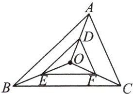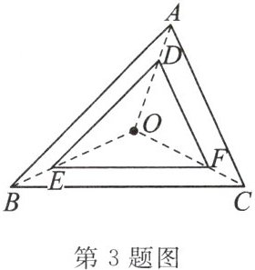 3. 如图,O 是△ABC 内任意一点,D,E,F 分别为 AO,BO,CO 上的点,且 $ AD = \frac{1}{3}AO $,$ BE = \frac{1}{3}BO $,$ CF = \frac{1}{3}CO $,则△ABC 与△DEF 是位似三角形,此时两三角形的位似中心是