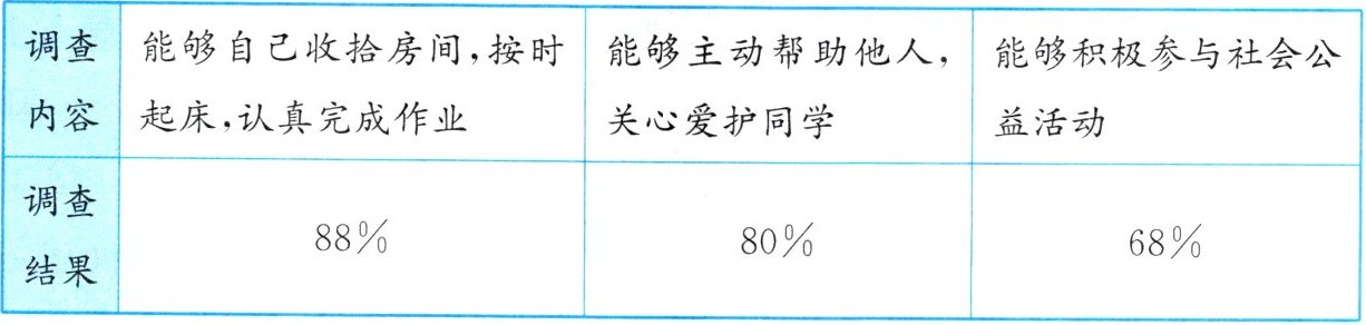 |调查内容|能够自己收拾房间,按时起床,认真完成作业|能够主动帮助他人,关心爱护同学|能够积极参与社会公益活动|