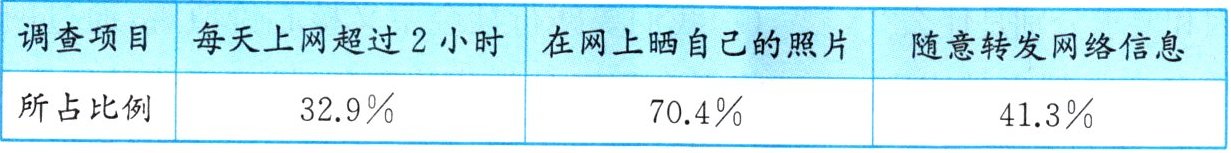 |调查项目|每天上网超过2小时|在网上晒自己的照片|随意转发网络信息|