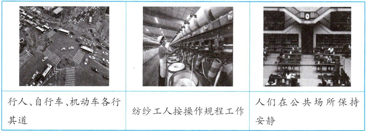 |行人、自行车、机动车各行其道|纺纱工人按操作规程工作|人们在公共场所保持安静|