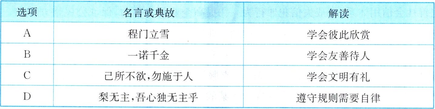 4. 道德是社会关系的基石,是人际和谐的基础。以下名言或典故与解读对应一致的是( )