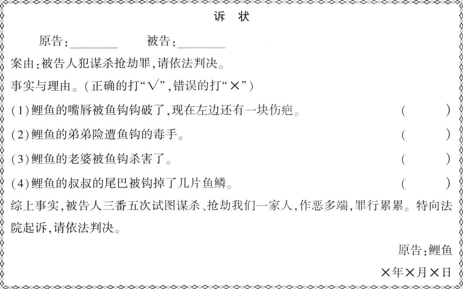 3. [信息提取]请你根据童话故事的内容,替鲤鱼完成诉状。