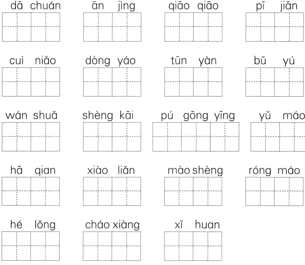 啦(lā)、衔(xián)、悄(qiǎo)、吞(tūn)、捕(bǔ)、耍(shuǎ)、拢(lǒng)、舱(cāng)、鹦(yīng)、衔(xián)、蒲(pú)、欠(qiàn)