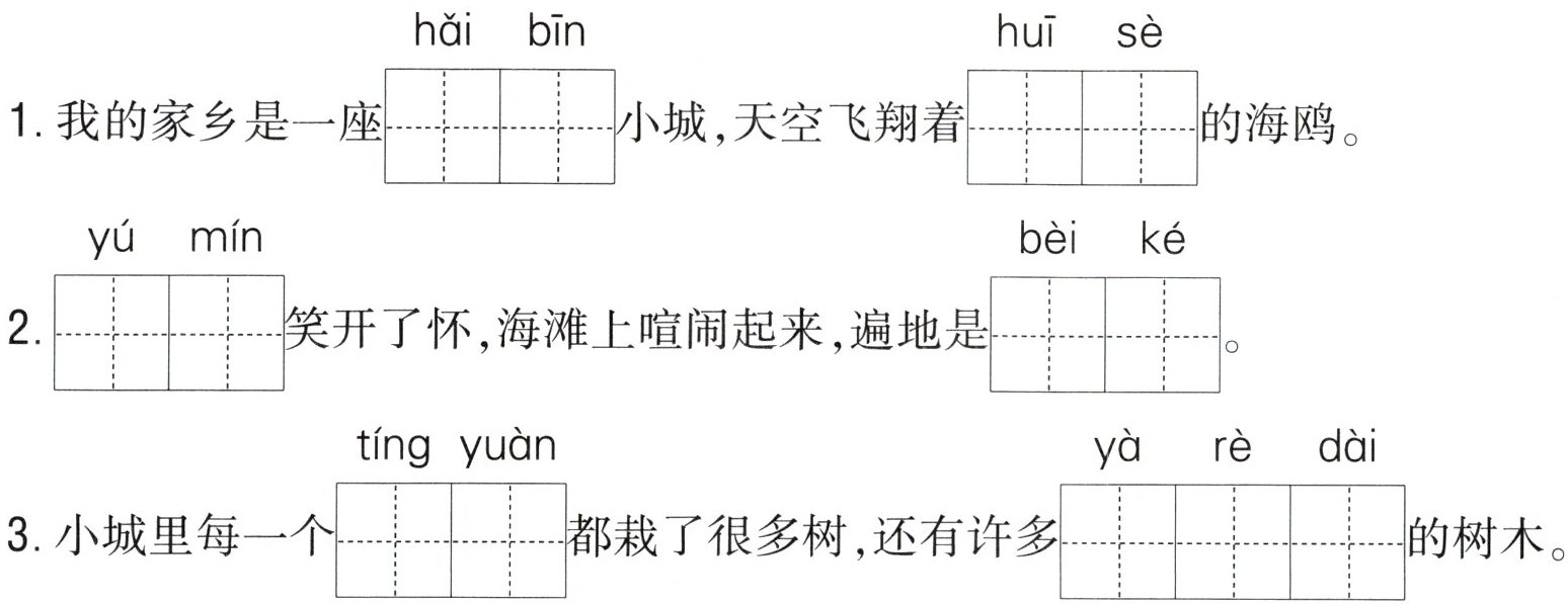 1. 海滨 灰色 2. 渔民 贝壳 3. 庭院 亚热带