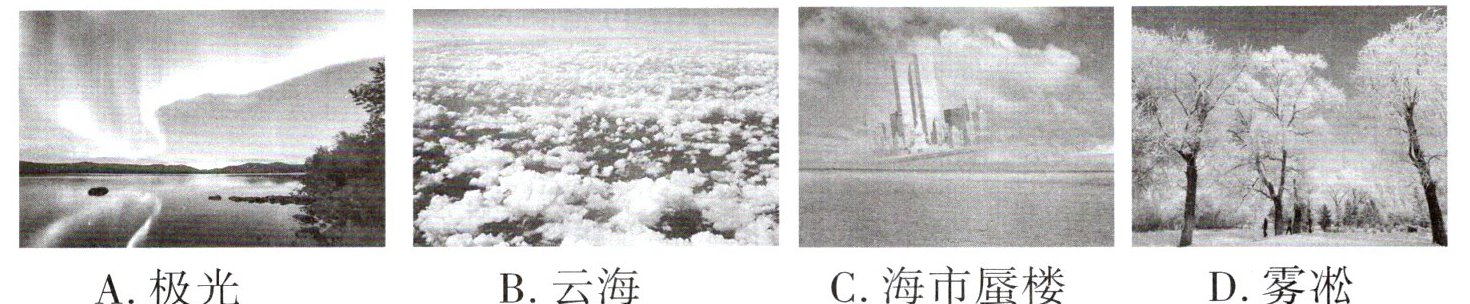 (1) 极光 (2) 云海 (3) 海市蜃楼 (4) 雾凇
