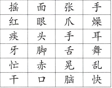 1.摇头晃脑 面红耳赤 张牙舞爪 手疾眼快 口干舌燥 手忙脚乱 2.