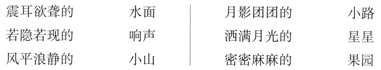 震耳欲聋的——响声 若隐若现的——小山 风平浪静的——水面 月影团团的——果园 洒满月光的——小路 密密麻麻的——星星