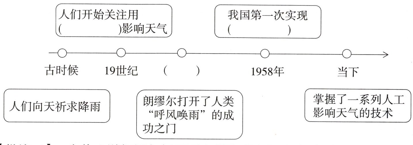 ②随着时代的发展,到 19 世纪时,人类已经知道雨是由空气中的水汽凝结而成的这一降雨原理。于是人类开始关注用科学技术影响天气。但无数科学家的实验都失败了。