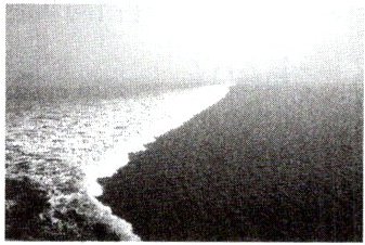 看完了波澜壮阔的“一线潮”,又见江南岸出现一条潮带,与江东面卷来的一条潮龙逐渐交叉接近,由于日光的映照,东潮黑浪卷,南潮白浪翻,如同黑白两条巨龙。二龙抢滩,必有一场恶战!当两条潮带拦腰撞击之时,你会听到山呼海啸的呐喊,水柱腾烟,形成伞云,如同飞瀑,倾盆直泻。渐渐地,两潮交汇成十字形的“浪城”。
