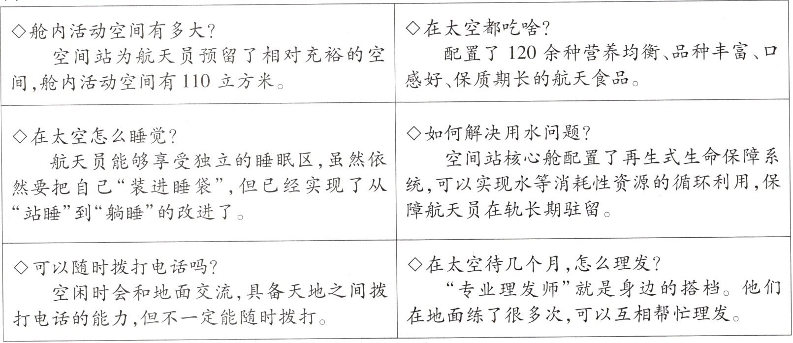 (3)√ 2. C 3. C 4. 示例:我认为“天宫课堂”的开展是非常有意义的。首先,活动展现了我国航天科技的飞速发展,给国人带来自信和力量;其次,太空神奇世界的展示能够激发青少年探索科学的兴趣;最后,一个个科学实验的演示和讲述,让我们切实地感受到科学的奥妙。