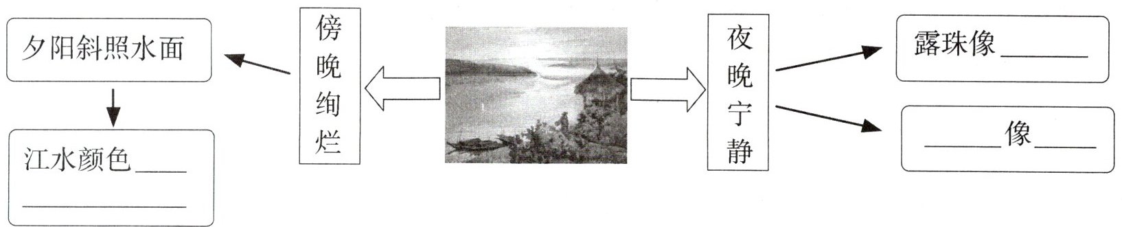 三、下面是琪琪绘制的《暮江吟》思维导图,请你帮他补充完整。