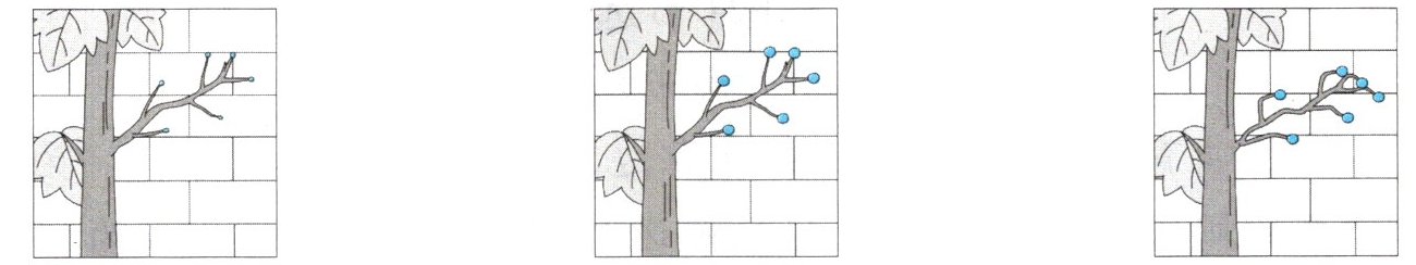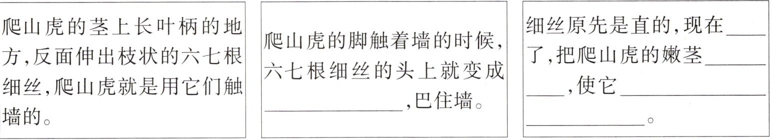 四、下面是小东观察爬山虎爬墙过程时画的图画,请根据课文内容帮他补充记录。