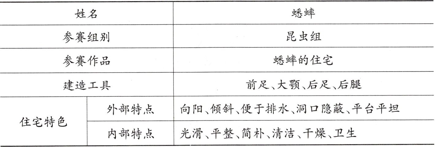 蟋蟀先生的住宅在本次大赛中被评为“昆虫组最伟大的工程”,请你结合上述表格,用“因为……所以……”的句式帮评委写出评选理由。