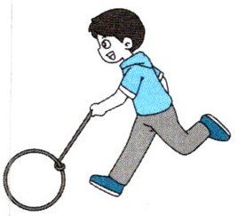 ①推铁圈是那时我们最喜欢玩的游戏之一。玩这种游戏,首先要找一个直径约三十厘米的铁圈,然后准备一根铁条,将前头弯成一个小钩(相当于卡槽),后面弯成一个握手,做成推杆。两者准备好后,就可以推着玩了。
