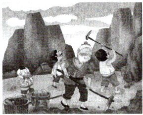 邻居家有个遗腹子,只有七八岁,刚刚换牙齿,看见大家干活儿干得这么起劲,也跑跑跳跳地前来帮忙。河曲智叟看见他们这么辛苦,笑着去阻挡愚公说:“老头儿,歇口气,像你这样风烛残年的人,能把这两座大山怎么样呢?”