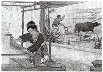 1. 画面中,织女端坐织布机前,纤手轻拈丝线,银梭在锦缎上翻飞,织出朵朵云霞。