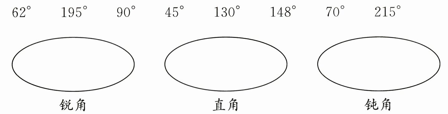 锐角:62° 45° 70° 直角:90° 钝角:130° 148°