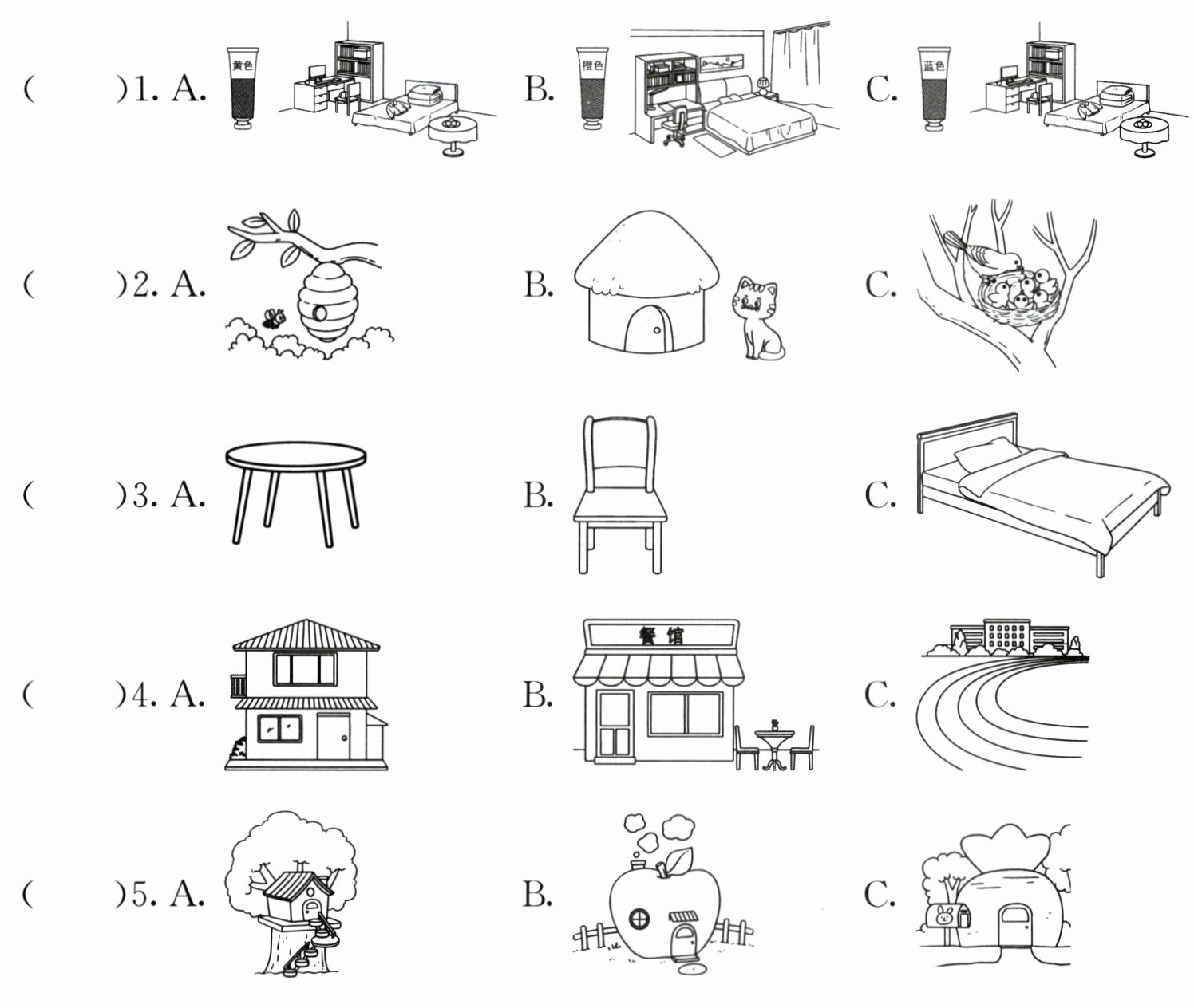 四、听对话,选图片。请根据你听到的对话内容,选出相应的图片,并将其字母标号填入题前括号内。每小题读两遍。(每小题 2 分,共 10 分)