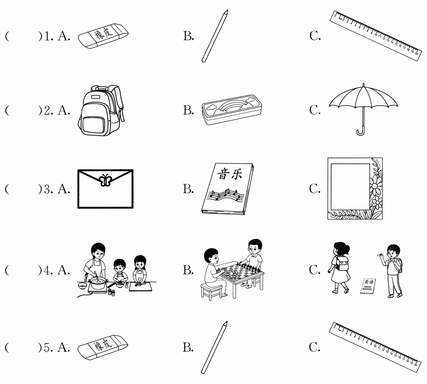 四、听对话,选图片。请根据你听到的对话内容,选出相应的图片,并将其字母标号填入题前括号内。每小题读两遍。(每小题 2 分,共 10 分)
