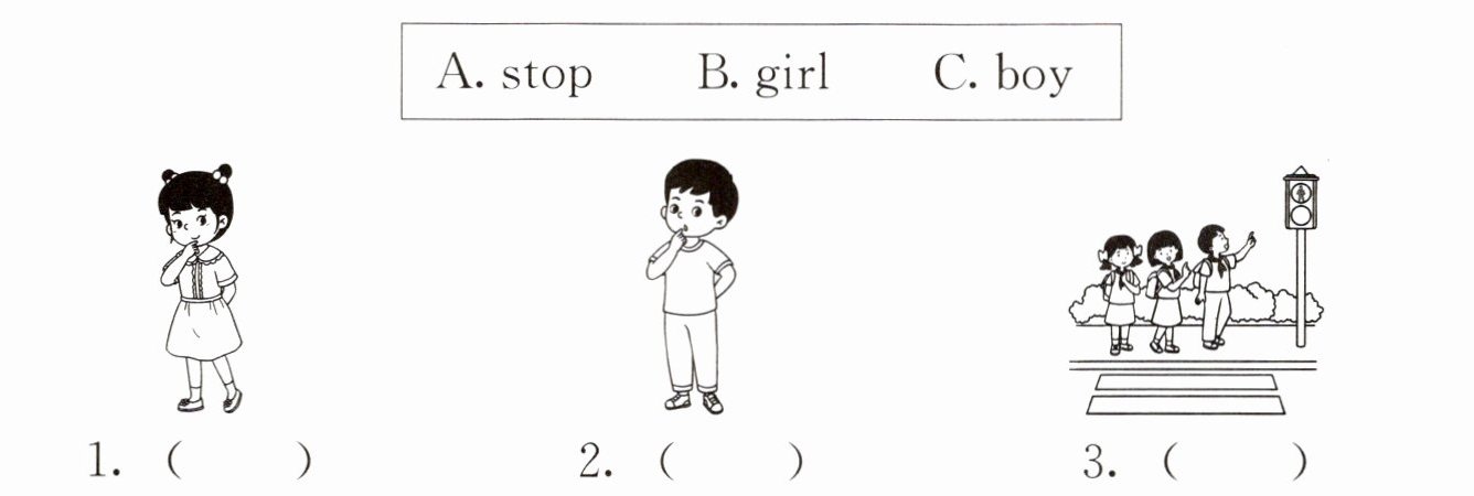 一、看图认单词。给下列图片选择正确的单词,并将其字母标号填在图下的括号内。